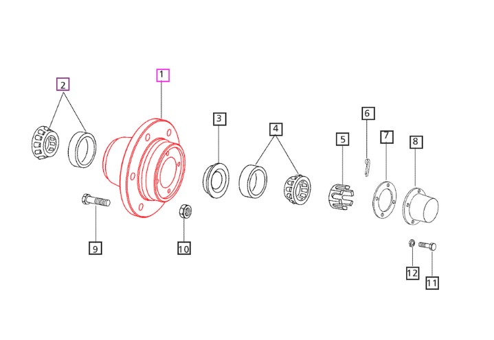 | 005555556R2 | HUB Front Wheel | 05 Series | E350 | Front Axle | FRONT WHEEL HUB ASSEMBLY - (PART 1) | 2 |