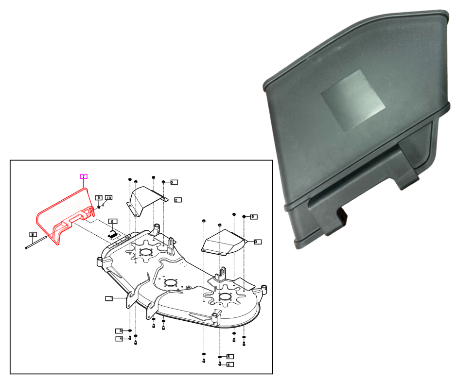 | 93802005102 Replaces 93802005100A | SIDE COVER | Mower | TYM-eMax54M 54” Mower (eMax20S) | EMAX54M 54” MOWER (EMAX20S) | TYM-EMAX54M 54” MOWER (EMAX20S)._FIG 105 | MOWER DECK SERVICE PARTS PART 4 |