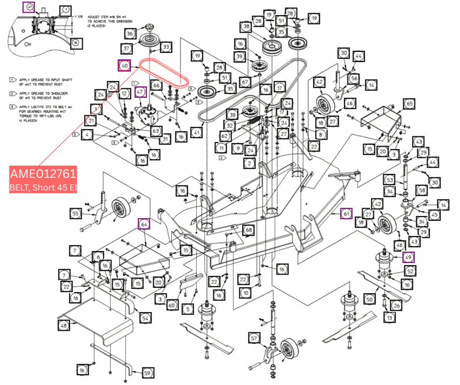 | AME012761 | BELT, Short 45 El | Mower | AMEREQUIP-MAH1660 Basic 60" Mower (2516/Max28XL) | MAH1660 Basic 60" Mower (SN # 1001 & later) | MAH1660-60-MD-11 | MOWER DECK PARTS BREAKDOWN |